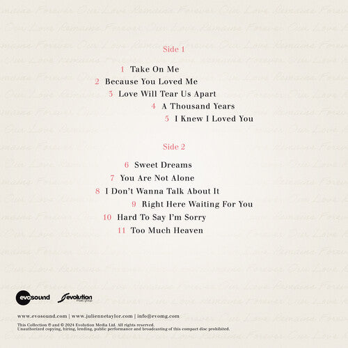 Julienne Taylor is back with three new ethereal covers, "Take On Me", "Love Will Tear Us Apart" and "Sweet Dreams," teaming up with Scottish traditional multi-instrumentalist Fraser Fifield and infusing them with an indelible Celtic ambiance that highlights her spell-binding vocals. The album also includes newly-remastered versions of her best-loved songs, with Julienne adding a bewitching twist to timeless tracks like "I Knew You I Loved You," "I Don't Want To Talk About It" and "A Thousand Years". Julienne is known for her ability to craft breathtaking arrangements, "Forever Our Love Remains" is her second LP since her acclaimed release, "A Time For Love," and comes eight years after her 2016 album, "When We Are One." This hand-picked selection of songs truly reflects the best of Julienne Taylor's repertoire, and fans are sure to find it worth the wait. The album will be released on 180g Vinyl LP, SACD -
